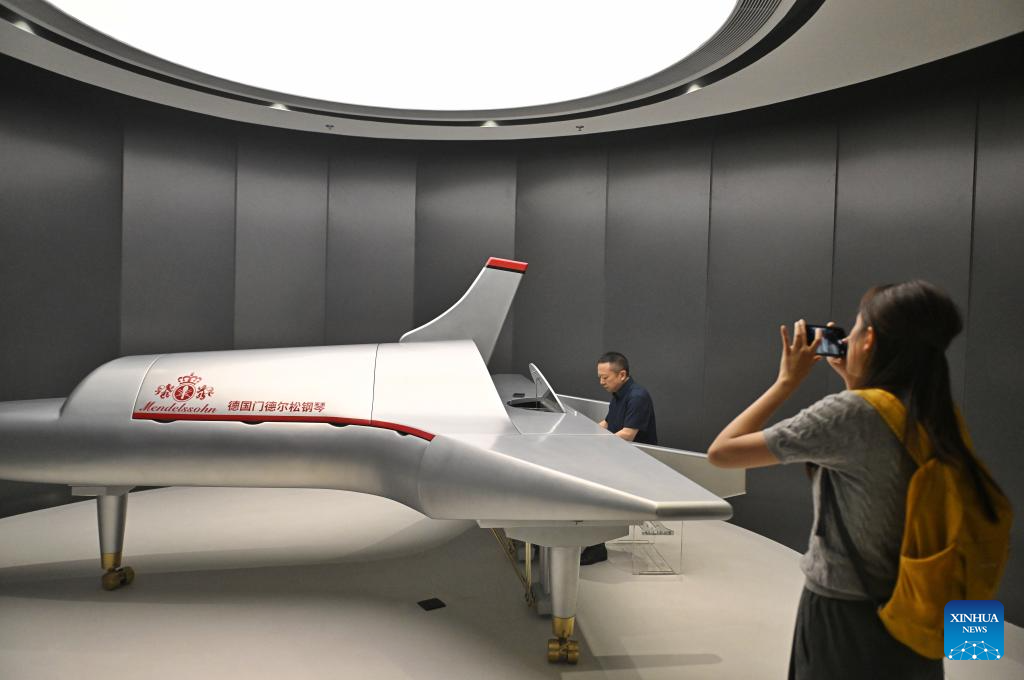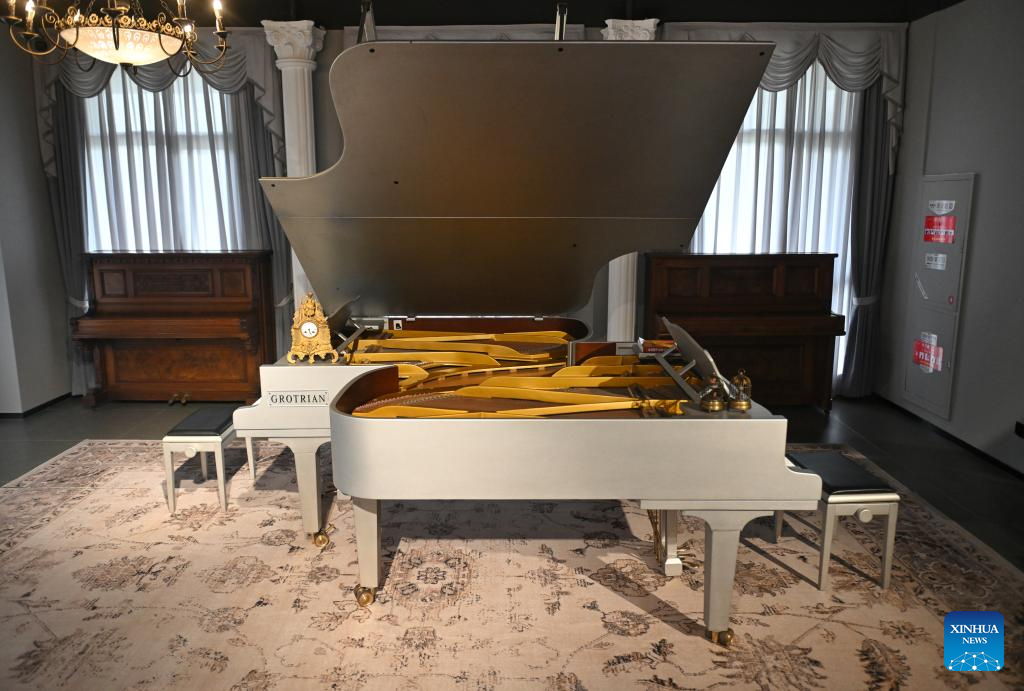This photo taken on May 8, 2025 shows a German piano displayed at the Chengdu Xin Smart Music Museum in Chengdu, southwest China's Sichuan Province. Chengdu Xin Smart Music Museum, home to a collection of over 300 instruments from all over the world, is designed to enable an immersive experience for visitors. With technologies such as 3D imaging, holographic theatres, and digital scene restoration, it reflects virtual historical scenarios, tells stories behind music works, and sheds light on technology innovations in those instruments. The museum has received about 50,000 visitors in since it opened on April 30, 2024. (Xinhua/Liu Kun)