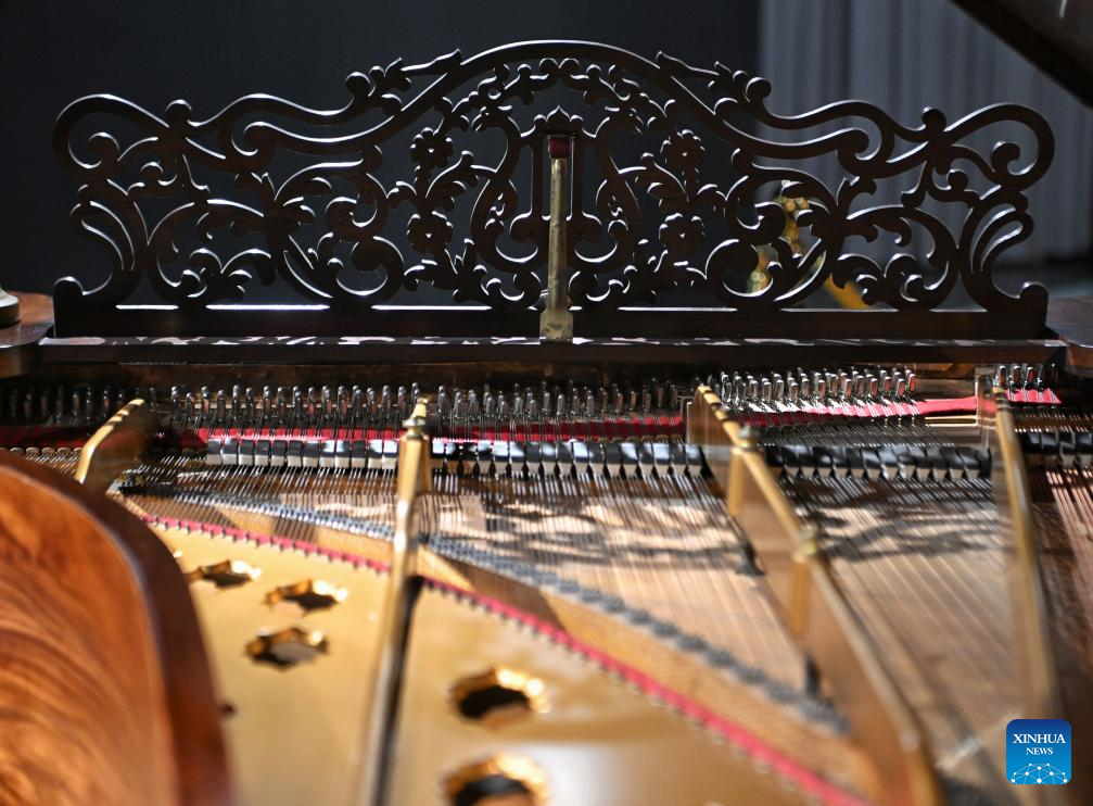 This photo taken on May 8, 2025 shows part of a piano made in the U.S. in 1859, displayed at the Chengdu Xin Smart Music Museum in Chengdu, southwest China's Sichuan Province. Chengdu Xin Smart Music Museum, home to a collection of over 300 instruments from all over the world, is designed to enable an immersive experience for visitors. With technologies such as 3D imaging, holographic theatres, and digital scene restoration, it reflects virtual historical scenarios, tells stories behind music works, and sheds light on technology innovations in those instruments. The museum has received about 50,000 visitors in since it opened on April 30, 2024. (Xinhua/Liu Kun)