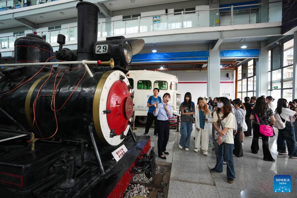 People visit Yunnan Railway Museum in Kunming, southwest China's Yunnan Province, May 14, 2025. Housed in Kunming North Railway Station, the Yunnan Railway Museum takes the century-long development history of Yunnan railway as the leading story line to narrate the frog-leaping evolution railway gauge standards from meter gauge to inch gauge, and standard gauge, as well as railway technologies from steam locomotives to high-speed rails. (Xinhua/Chen Xinbo)