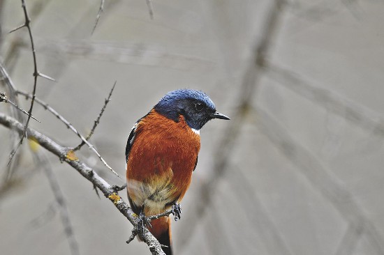 A white-throated redstart rests on a tree branch in Zhugusi village, Zhugu township, Menyuan county, Haibei Tibetan Autonomous Prefecture, northwest China's Qinghai Province. (Photo/Qinghai Daily)