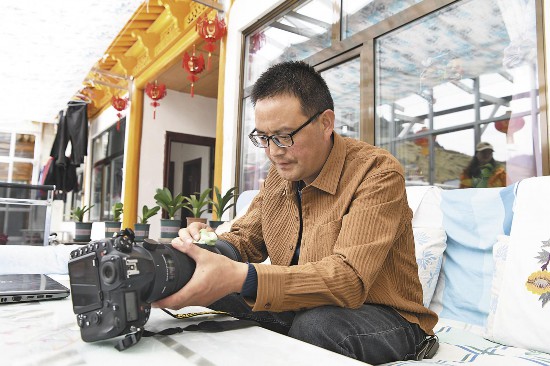 Wang Guozhong cleans a camera lens at home in Zhugusi village, Zhugu township, Menyuan county, Haibei Tibetan Autonomous Prefecture, northwest China's Qinghai Province. (Photo/Qinghai Daily)