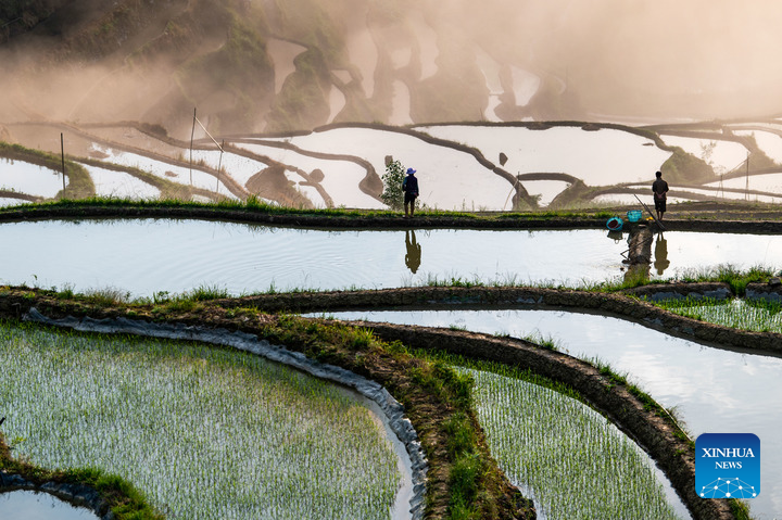 Villagers are pictured in the terraced fields in Congjiang County, southwest China's Guizhou Province, on April 28, 2025. (Xinhua/Yang Wenbin)