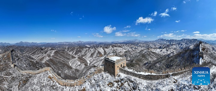 This aerial panorama photo taken on March 16, 2025 shows the snow scenery at the Jinshanling section of the Great Wall in Luanping County of Chengde, north China's Hebei Province. (Xinhua/Chen Yehua)