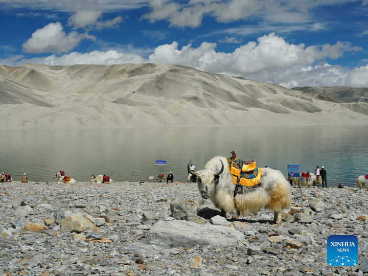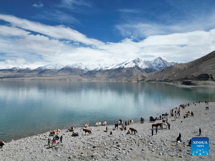 People visit the Baisha Lake scenic area in Akto County, northwest China's Xinjiang Uygur Autonomous Region, May 19, 2024. May 19 marks the China Tourism Day. (Xinhua/Yin Xingyu)