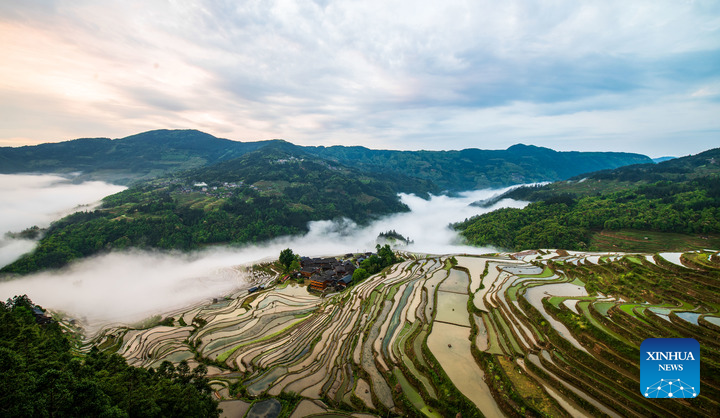 This photo taken on April 28, 2025 shows a view of the terraced fields in Congjiang County, southwest China's Guizhou Province. (Xinhua/Yang Wenbin)