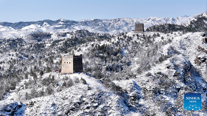 An aerial drone photo shows a section of the Great Wall after snowfall in Luanping County, north China's Hebei Province, March 16, 2025. (Photo by Wang Liqun/Xinhua)