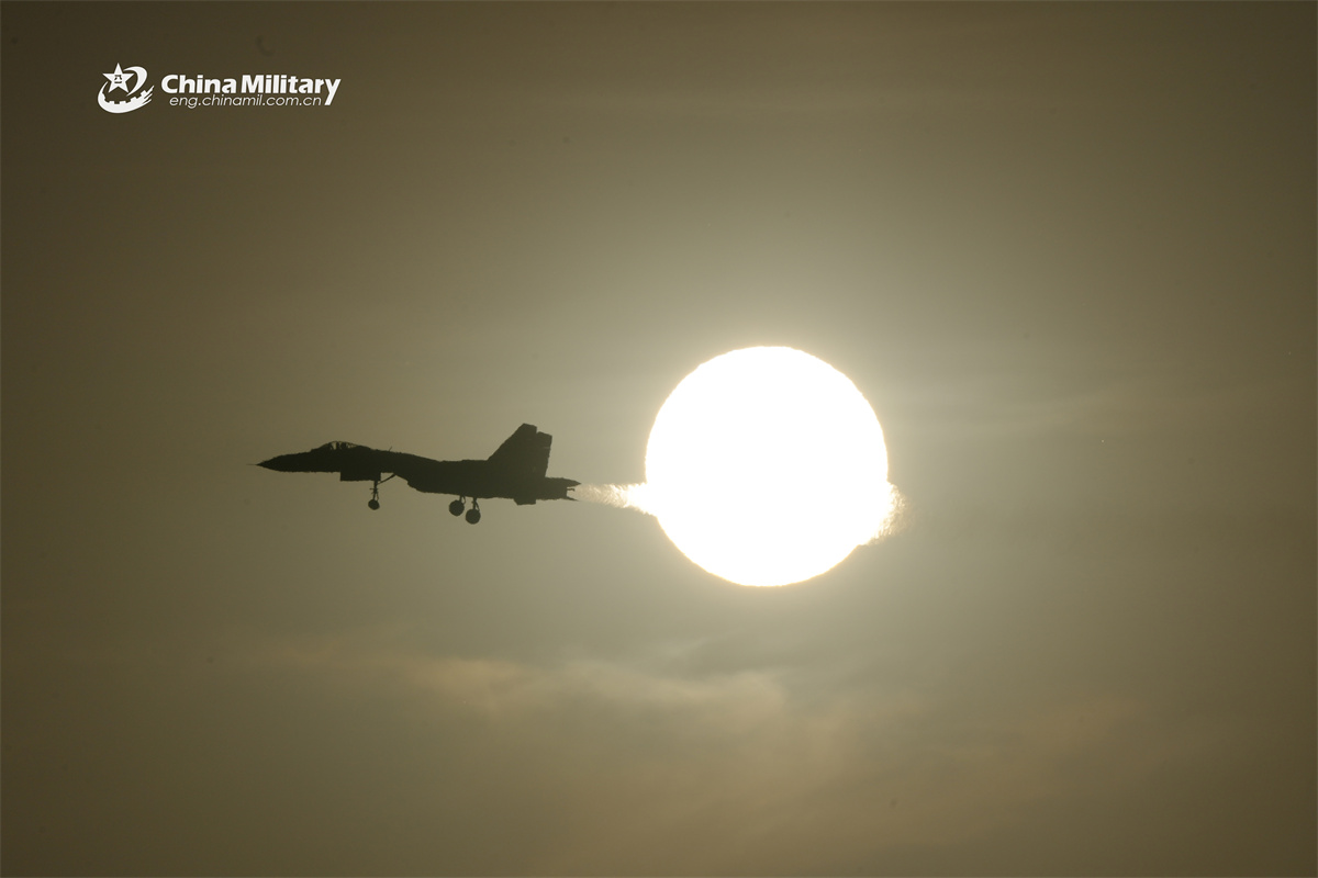 A fighter jet attached to a base under the Chinese PLA Naval Aviation University cuts a sharp shadow across the sun's molten glow during a recent flight training exercise. (eng.chinamil.com.cn/Photo by Wan Quan)