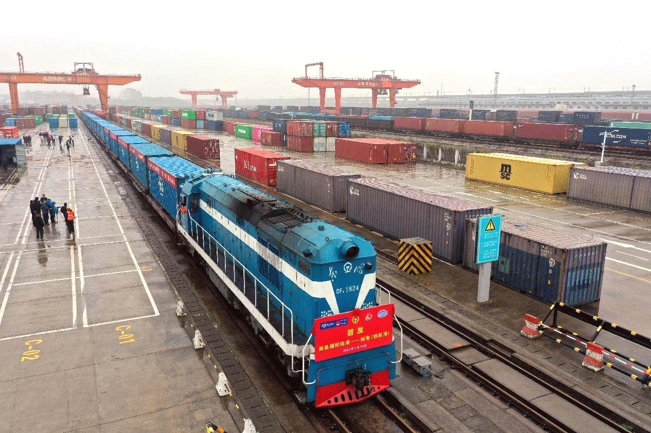 A rail-sea intermodal train loaded with automobiles departs from Nanchang, east China's Jiangxi province, bound for Chancay Port, Peru, March 14, 2025. (Photo by Shi Yu/People's Daily Online)