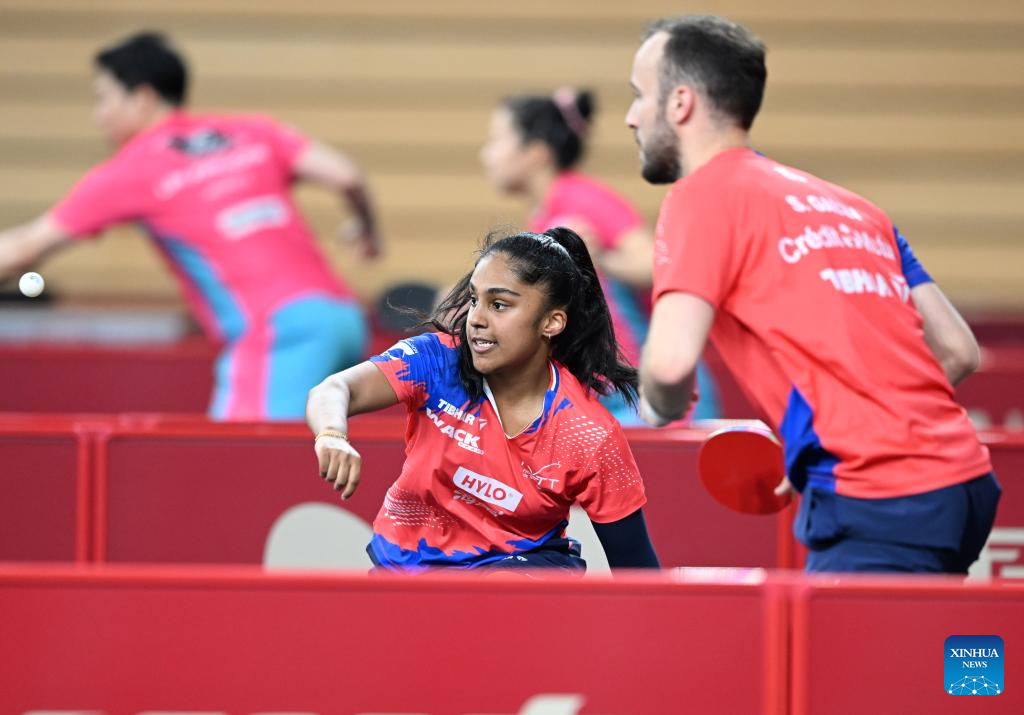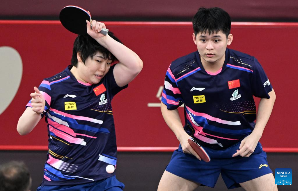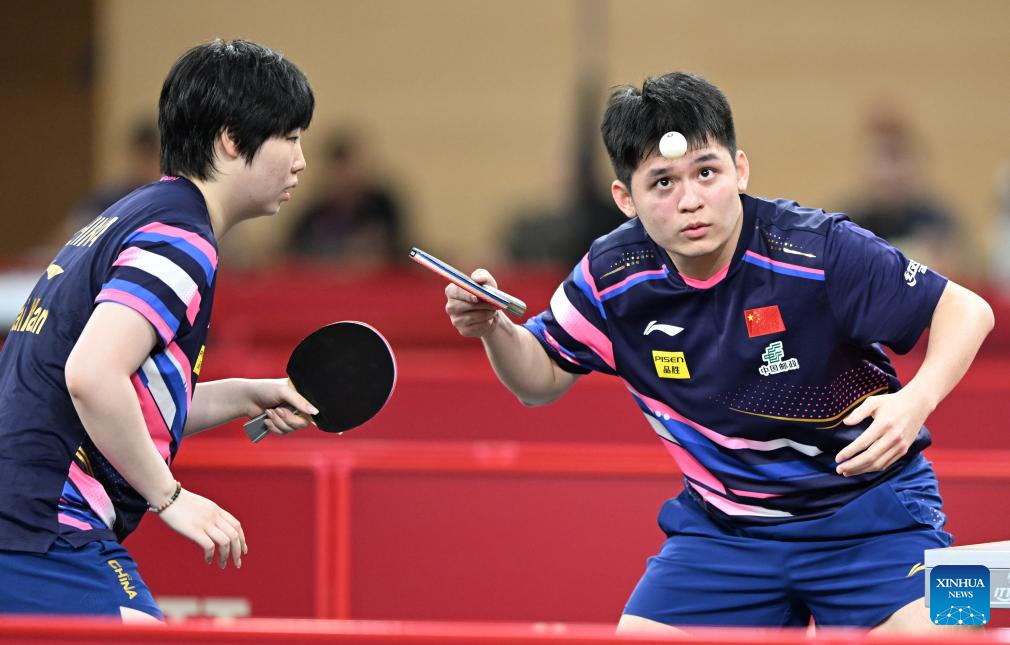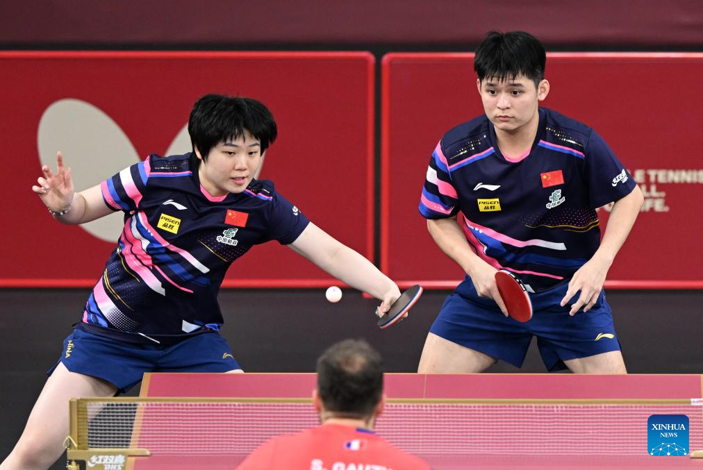 Lin Shidong (R)/Kuai Man of China compete against Simon Gauzy/Prithika Pavade of France during the mixed doubles round of 32 match at ITTF World Table Tennis Championships Finals Doha 2025 in Doha, Qatar, May 19, 2025. (Xinhua/He Changshan)