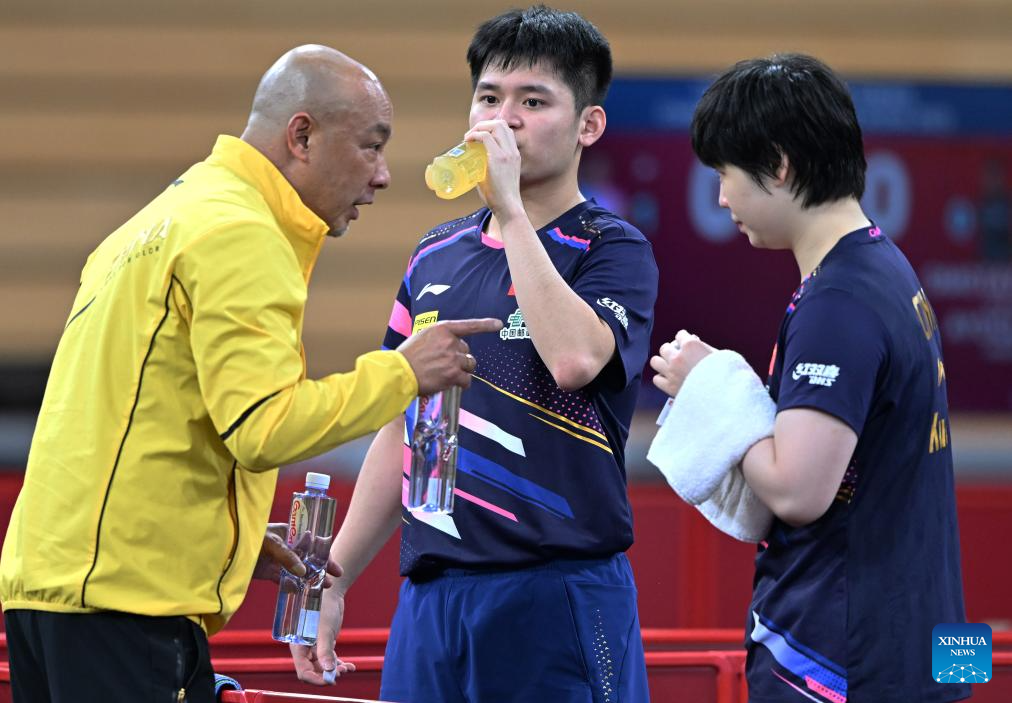 Lin Shidong (C)/Kuai Man (R) of China listen to their coach Xiao Zhan during the mixed doubles round of 32 match against Simon Gauzy/Prithika Pavade of France at ITTF World Table Tennis Championships Finals Doha 2025 in Doha, Qatar, May 19, 2025. (Xinhua/He Changshan)