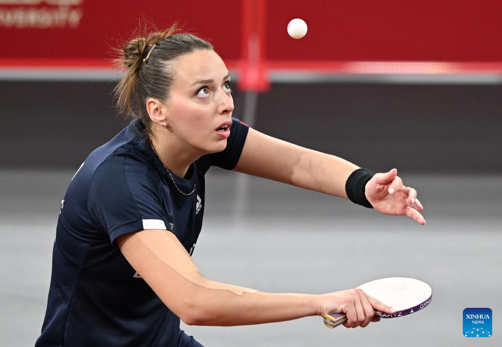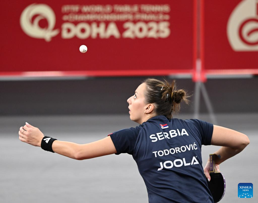 Andrea Todorovic serves during the women's singles round of 64 match between Shi Xunyao of China and Andrea Todorovic of Serbia at ITTF World Table Tennis Championships Finals Doha 2025 in Doha, Qatar, May 19, 2025. (Xinhua/He Changshan)