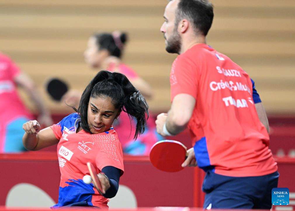 Simon Gauzy/Prithika Pavade (L) of France compete against Lin Shidong/Kuai Man of China during the mixed doubles round of 32 match at ITTF World Table Tennis Championships Finals Doha 2025 in Doha, Qatar, May 19, 2025. (Xinhua/He Changshan)