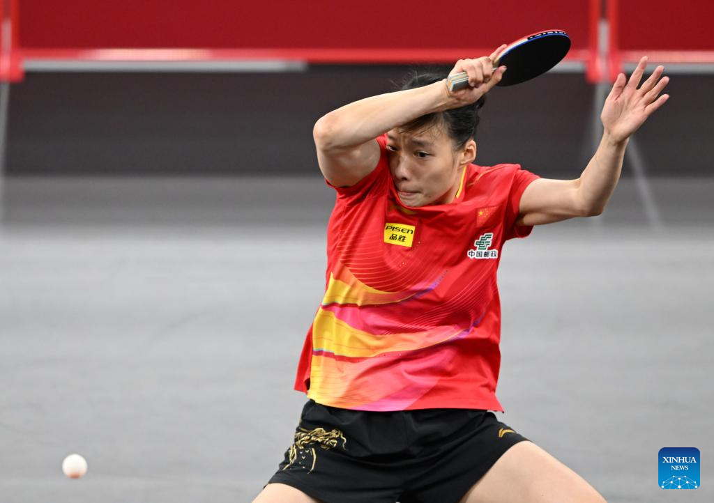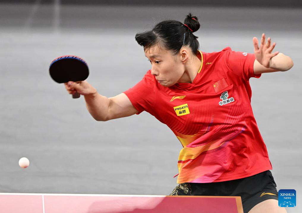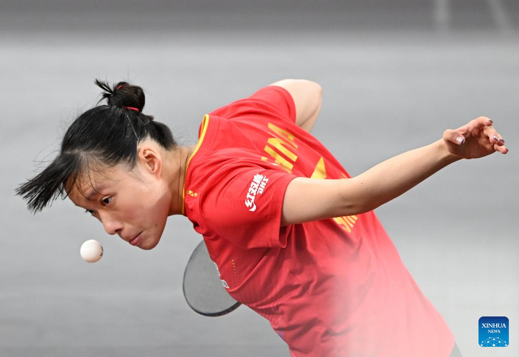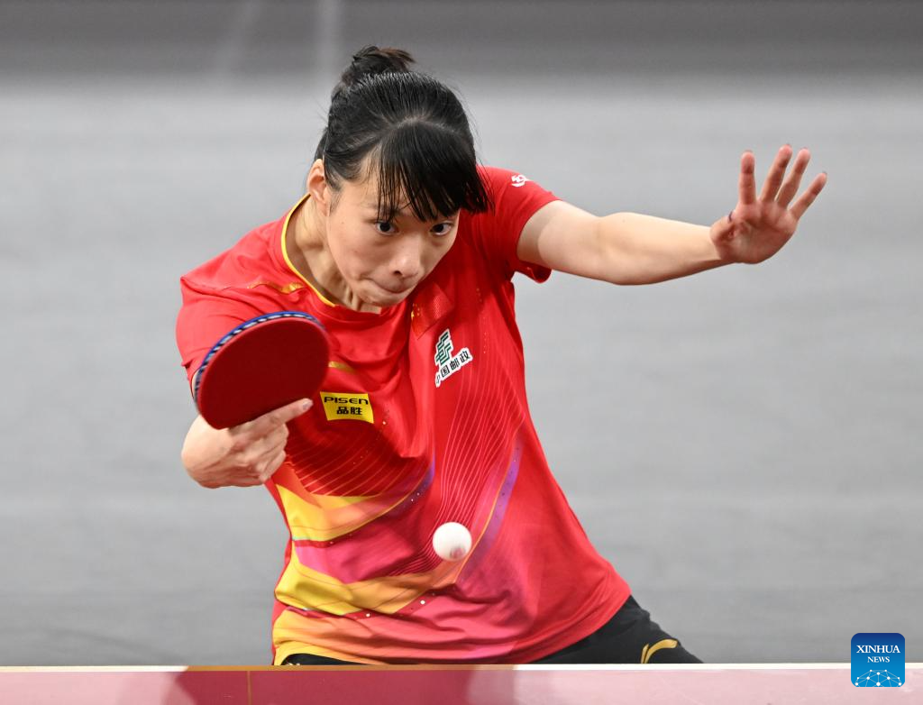 Shi Xunyao hits a return during the women's singles round of 64 match between Shi Xunyao of China and Andrea Todorovic of Serbia at ITTF World Table Tennis Championships Finals Doha 2025 in Doha, Qatar, May 19, 2025. (Xinhua/He Changshan)