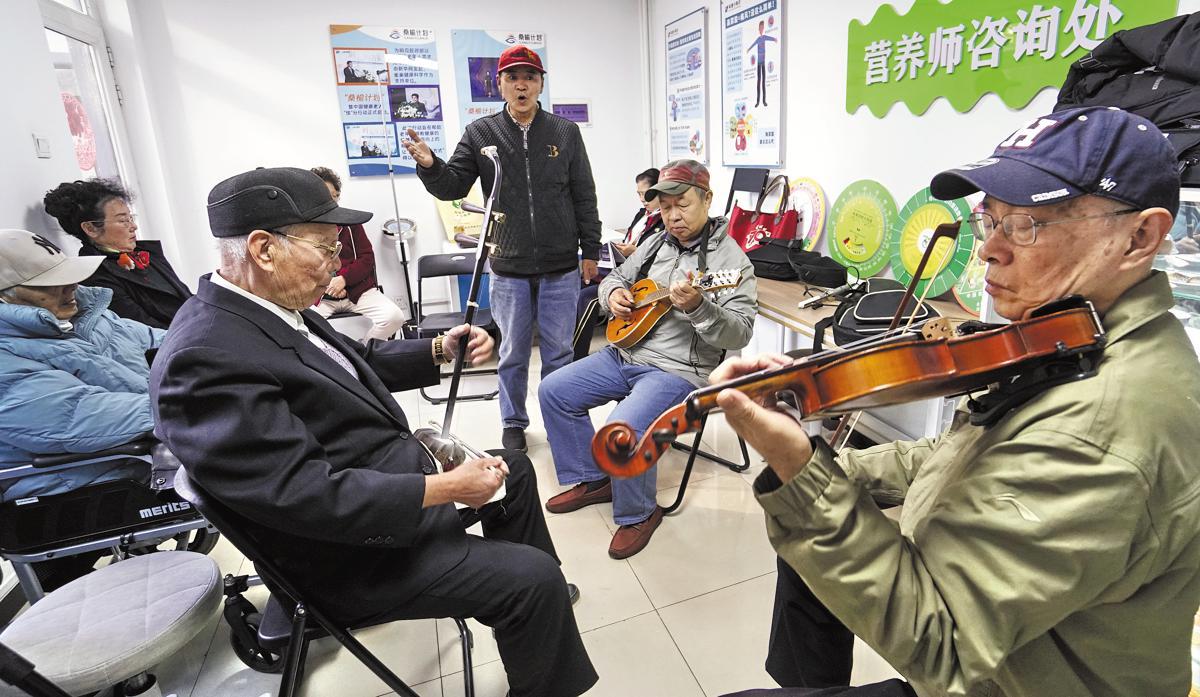 Residents of the Shuiduizi community in Chaoyang district play musical instruments at the community's elderly care center on Nov 5. (Li Xin/Xinhua)
