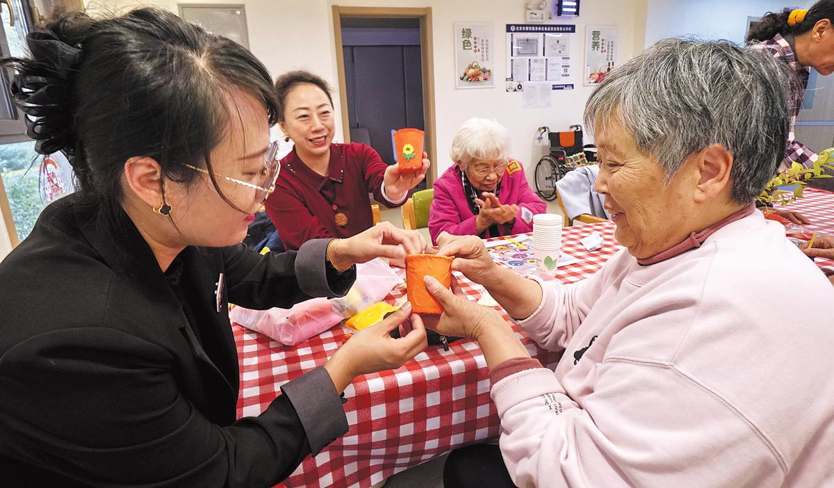 Employees from the elderly care service center teach the elderly how to make handicrafts in October. (Li Xin/Xinhua)