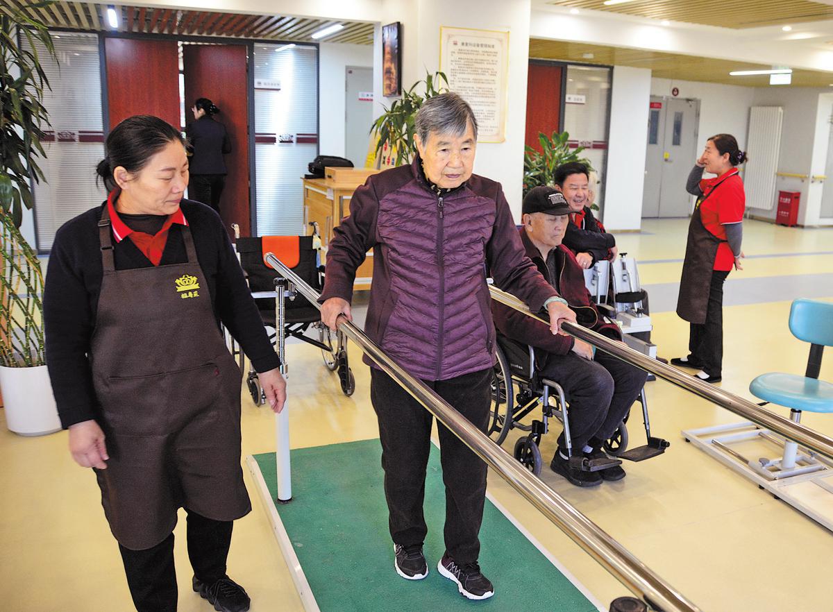 A woman undergoes rehabilitation at an elderly care service center in Laiguangying community in Beijing's Chaoyang district on Jan 10. (Li Xin/Xinhua)