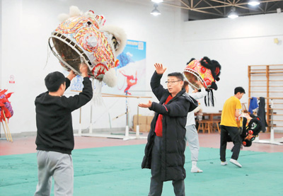 Cui Bingzhen (second left) instructs a foreign student to learn lion dance skills. (Photo/Yu Hong)