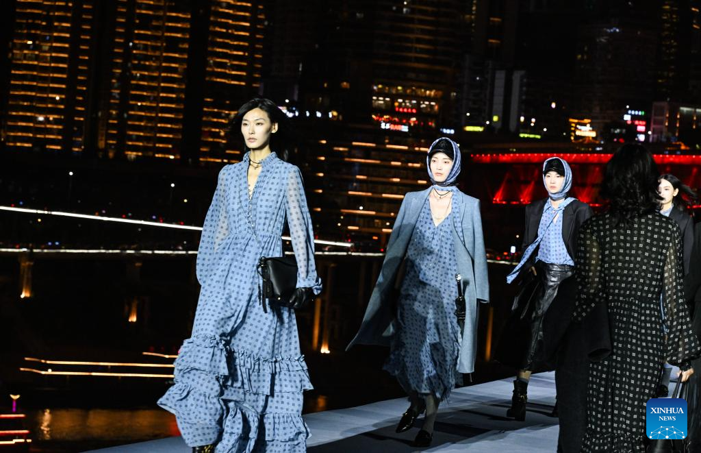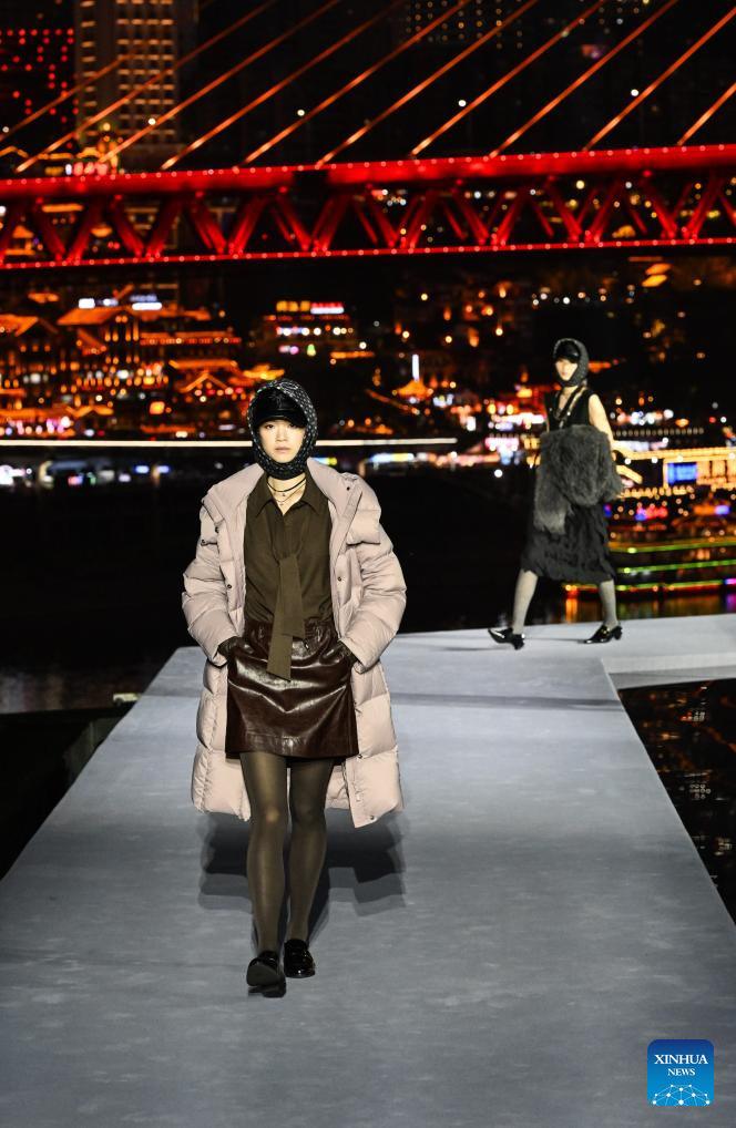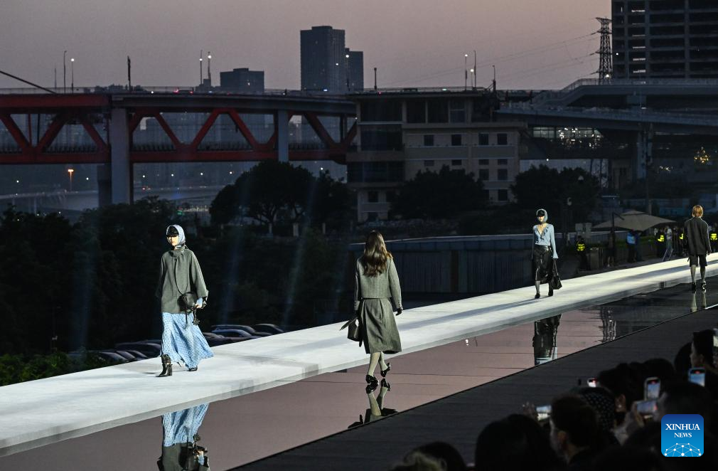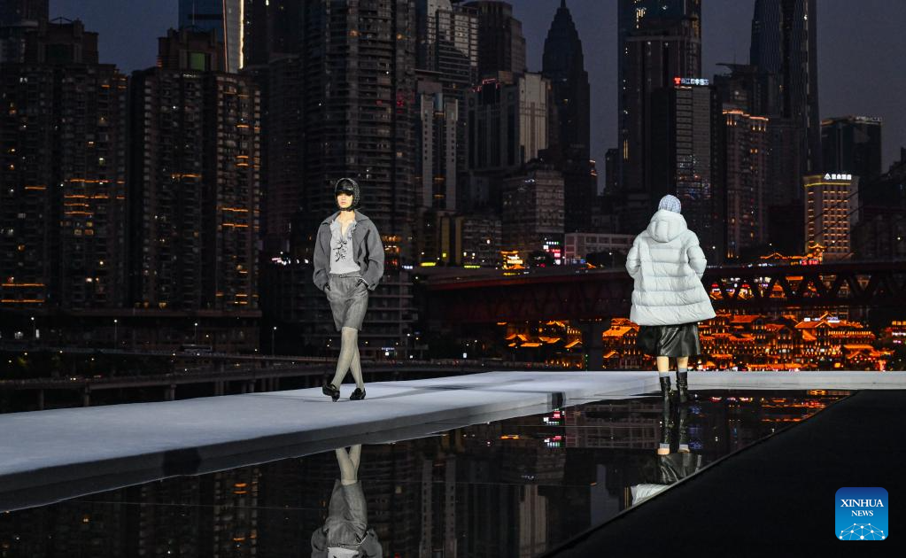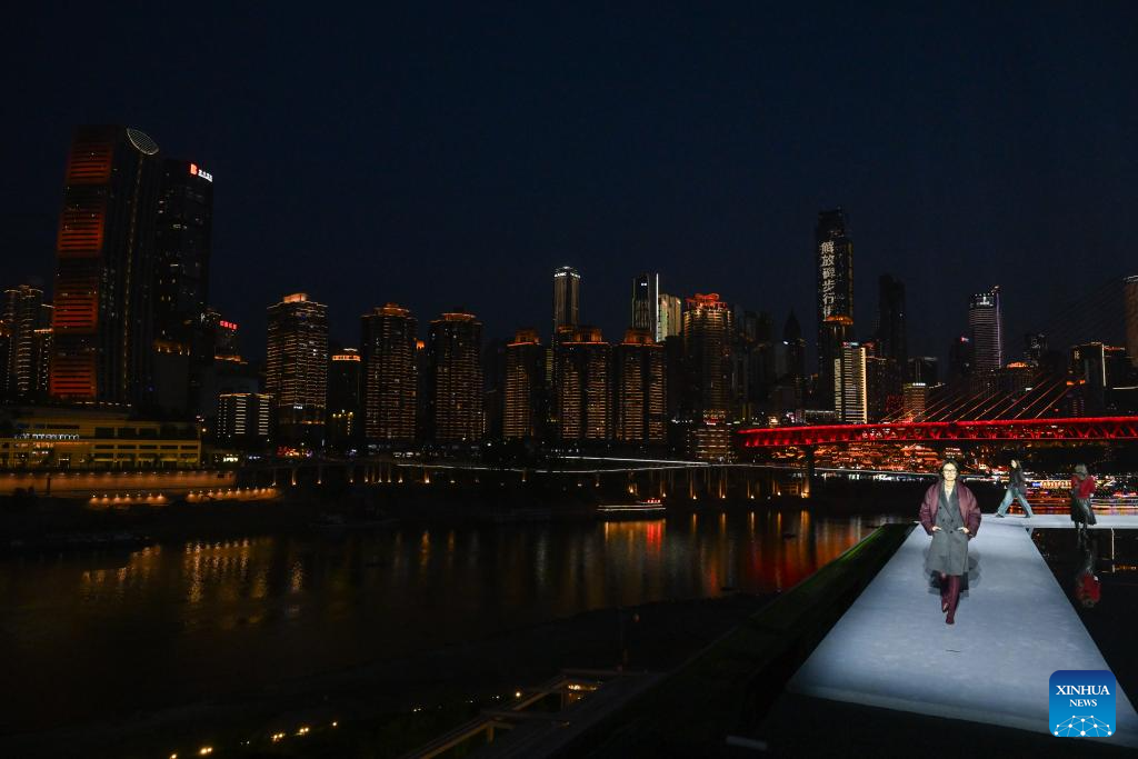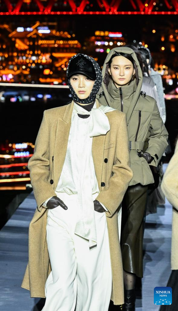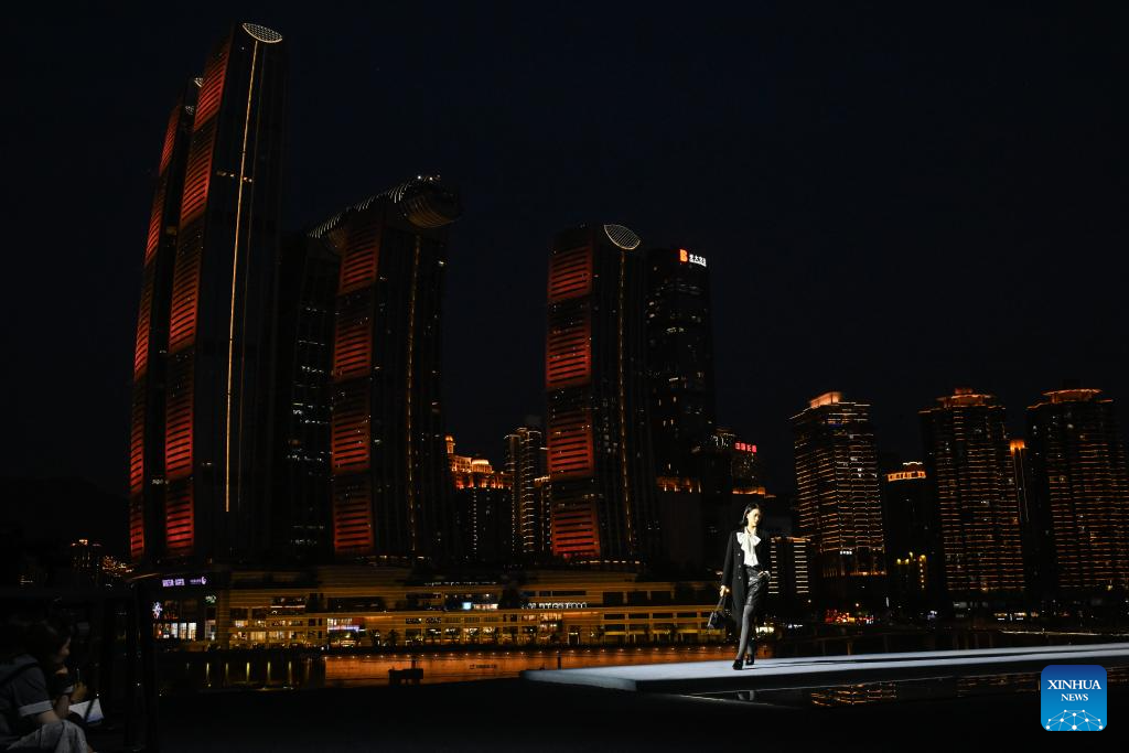 Models present creations from XUEGE 2025 winter collection during an outdoor fashion show in southwest China's Chongqing, May 19, 2025. The show, with the night view of the mega-city as the background, presented to the audience a combination of fashion creativity and metropolitan glamour. (Xinhua/Wang Quanchao)