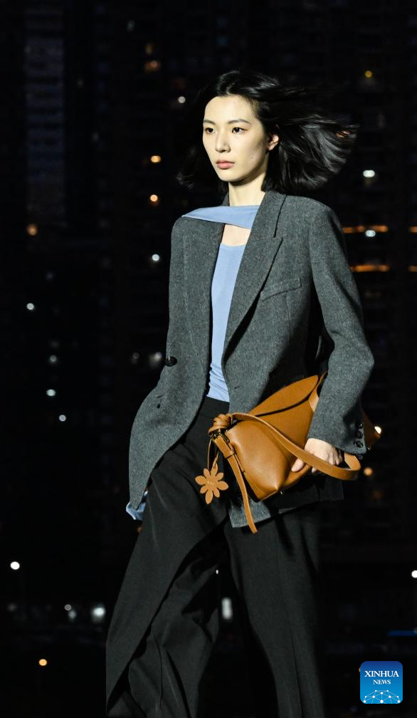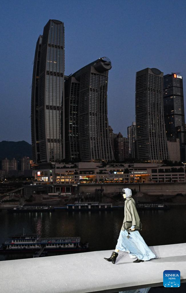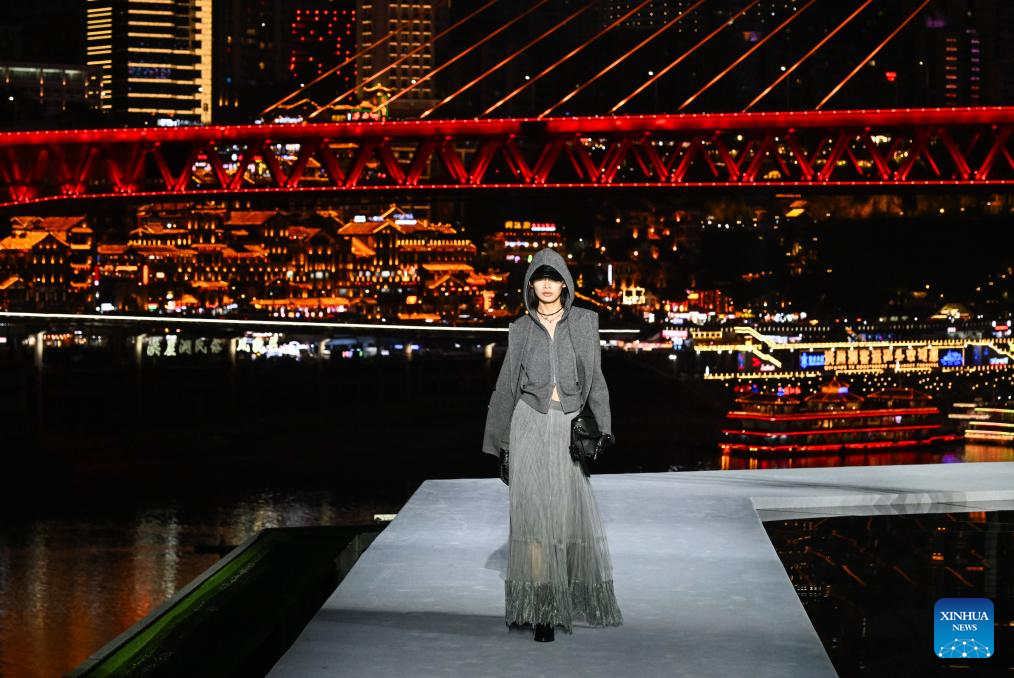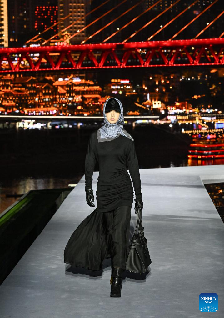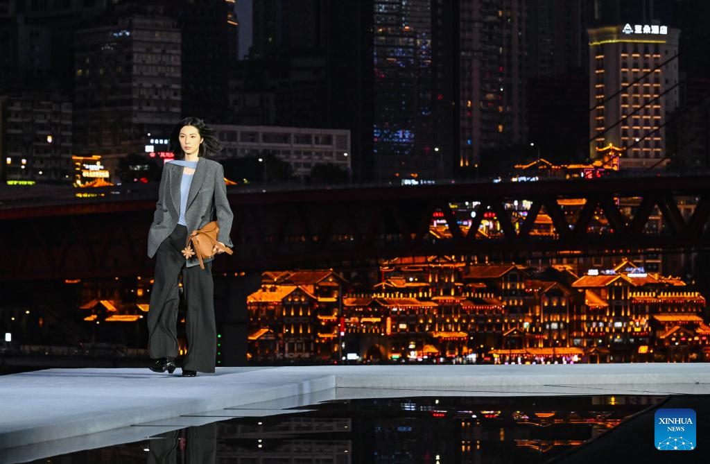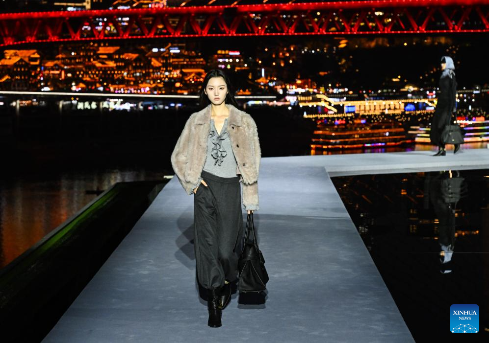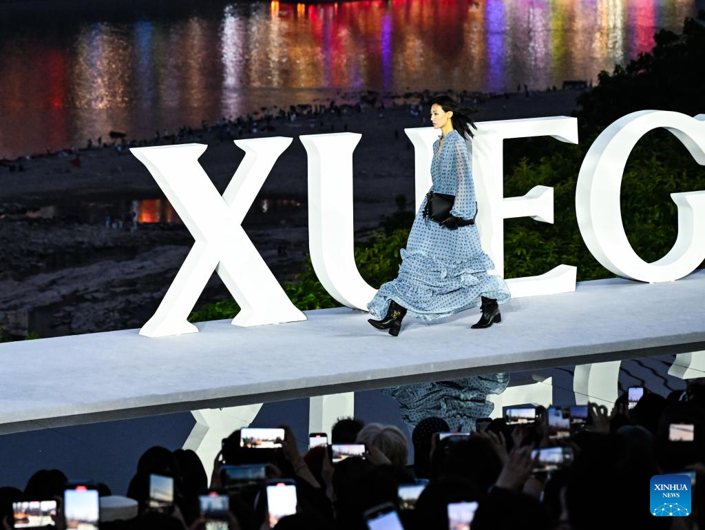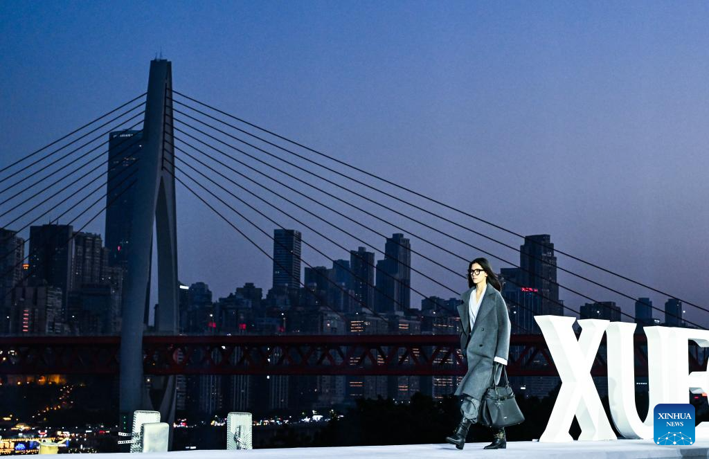 A model presents a creation from XUEGE 2025 winter collection during an outdoor fashion show in southwest China's Chongqing, May 19, 2025. The show, with the night view of the mega-city as the background, presented to the audience a combination of fashion creativity and metropolitan glamour. (Xinhua/Wang Quanchao)