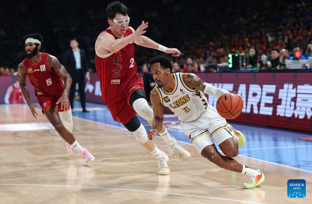 Barry Brown (R) of Zhejiang Lions dribbles the ball during the game 6 between Beijing Ducks and Zhejiang Lions at the 2024-2025 season Finals of the Chinese Basketball Association (CBA) league in Beijing, capital of China, May 20, 2025. (Xinhua/Wang Kaiyan)