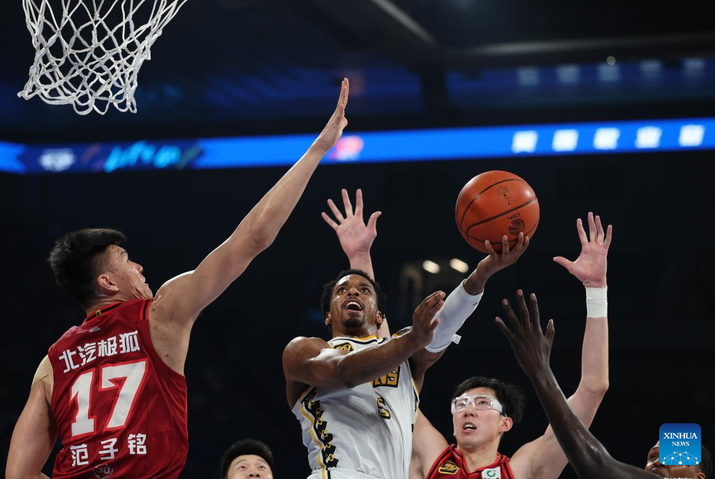 Barry Brown (C) of Zhejiang Lions goes for a lay-up during the game 6 between Beijing Ducks and Zhejiang Lions at the 2024-2025 season Finals of the Chinese Basketball Association (CBA) league in Beijing, capital of China, May 20, 2025. (Xinhua/Wang Kaiyan)