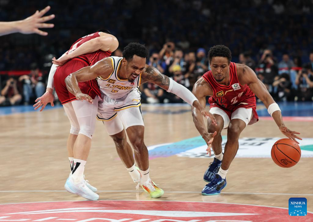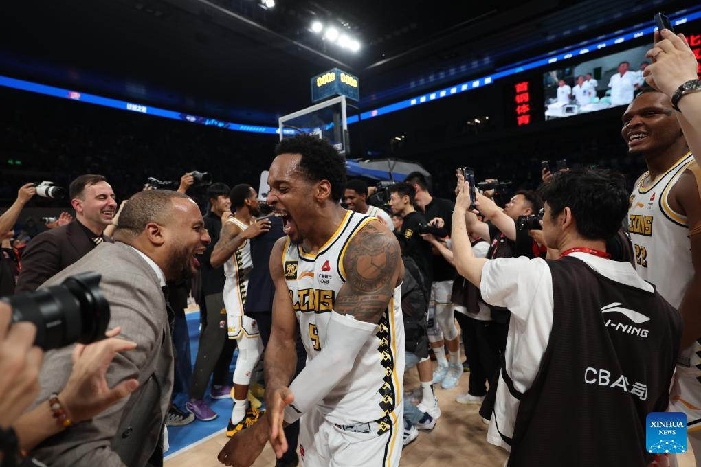 Barry Brown (C) of Zhejiang Lions celebrates after the game 6 between Beijing Ducks and Zhejiang Lions at the 2024-2025 season Finals of the Chinese Basketball Association (CBA) league in Beijing, capital of China, May 20, 2025. (Xinhua/Wang Kaiyan)