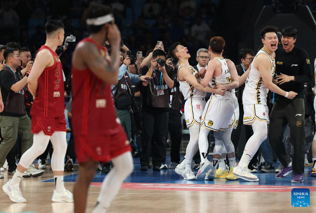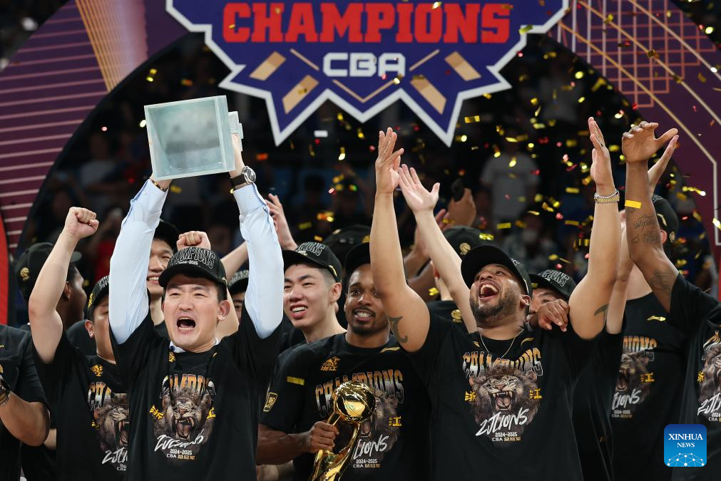 Players of Zhejiang Lions celebrate after the game 6 between Beijing Ducks and Zhejiang Lions at the 2024-2025 season Finals of the Chinese Basketball Association (CBA) league in Beijing, capital of China, May 20, 2025. (Xinhua/Wang Kaiyan)