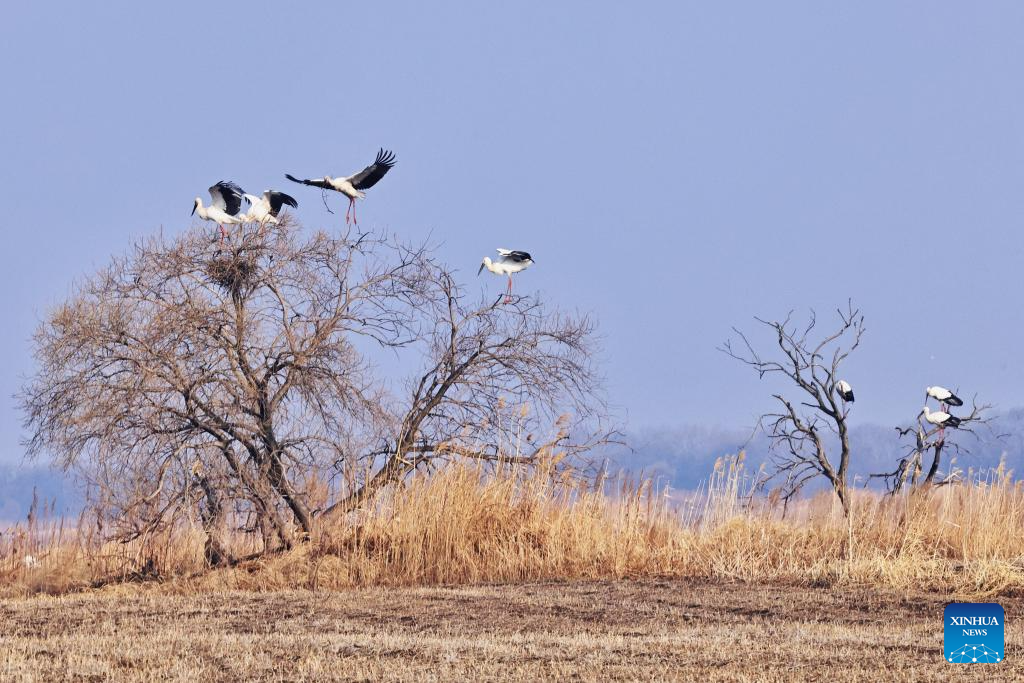 Oriental white storks are pictured at the Bachadao National Nature Reserve in Tongjiang, northeast China's Heilongjiang Province, April 19, 2025. Recently, northbound migratory birds have entered their breeding season at the reserve, a critical habitat and stopover site, where ongoing wetland restoration efforts have ensured food resources and habitats for these avian travelers. (Photo by Liu Wanping/Xinhua)