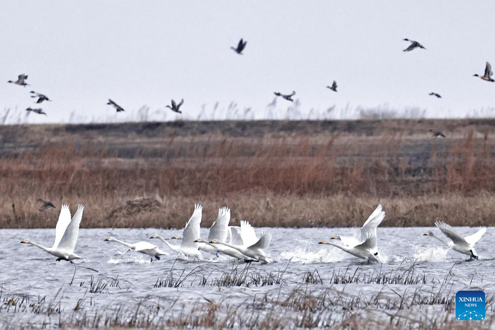 Swans are pictured at the Bachadao National Nature Reserve in Tongjiang, northeast China's Heilongjiang Province, April 19, 2025. Recently, northbound migratory birds have entered their breeding season at the reserve, a critical habitat and stopover site, where ongoing wetland restoration efforts have ensured food resources and habitats for these avian travelers. (Photo by Liu Wanping/Xinhua)