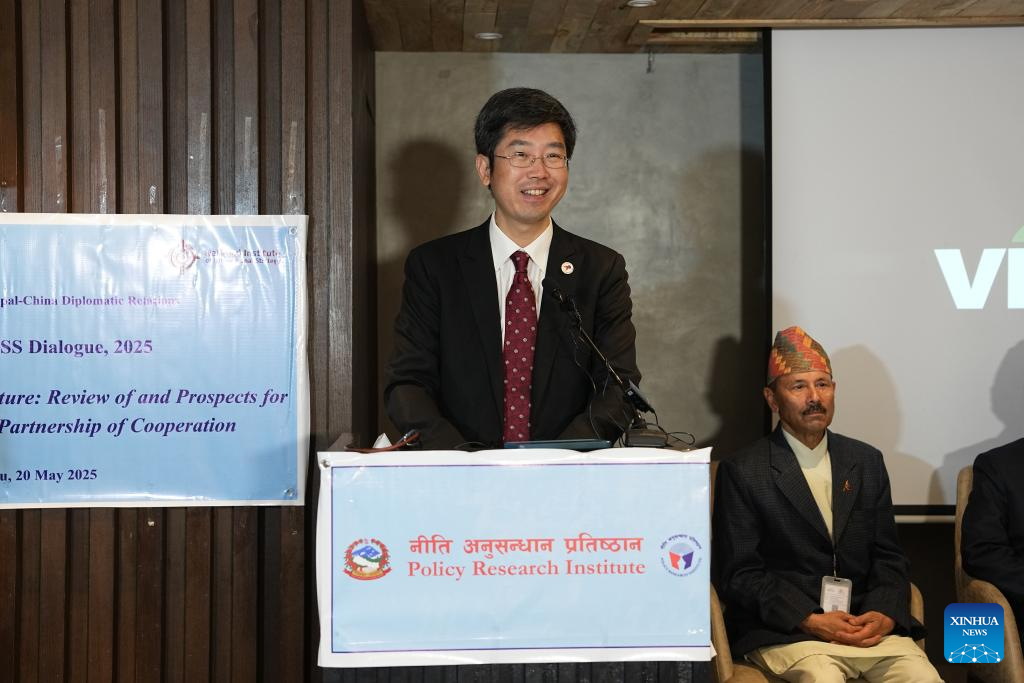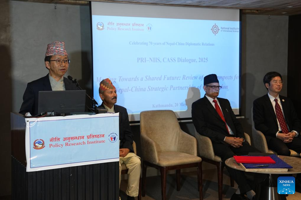 Wang Xin, a counselor at the Chinese Embassy in Nepal, addresses the seminar organized jointly by Nepal's Policy Research Institute and the National Institute of International Strategy under the Chinese Academy of Social Sciences in Kathmandu, Nepal, May 20, 2025. Strategic professionals and scholars from top think tanks of Nepal and China met in the Nepali capital on Tuesday and deliberated on the prospects for bilateral strategic partnership of cooperation on the occasion of the 70th anniversary of diplomatic ties. Government officials and experts from the two countries also attended the seminar organized jointly by Nepal's Policy Research Institute and the National Institute of International Strategy under the Chinese Academy of Social Sciences. (Xinhua/Yi Aijun)