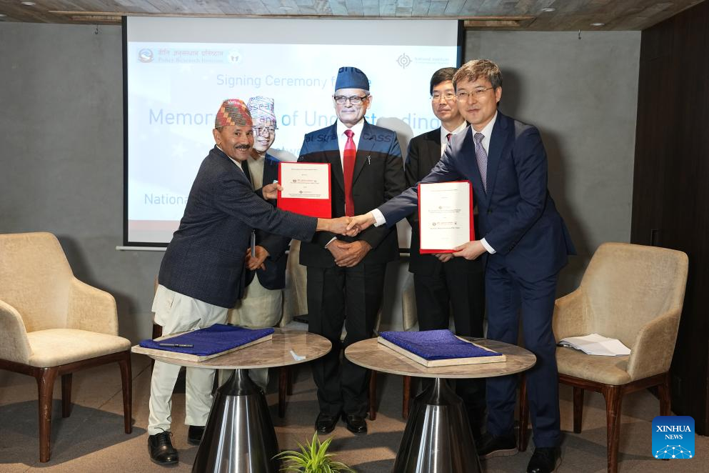 Nepal's Policy Research Institute and the National Institute of International Strategy under the Chinese Academy of Social Sciences sign a memorandum of understanding for cooperation in Kathmandu, Nepal, May 20, 2025. Strategic professionals and scholars from top think tanks of Nepal and China met in the Nepali capital on Tuesday and deliberated on the prospects for bilateral strategic partnership of cooperation on the occasion of the 70th anniversary of diplomatic ties. Government officials and experts from the two countries also attended the seminar organized jointly by Nepal's Policy Research Institute and the National Institute of International Strategy under the Chinese Academy of Social Sciences. (Xinhua/Yi Aijun)
