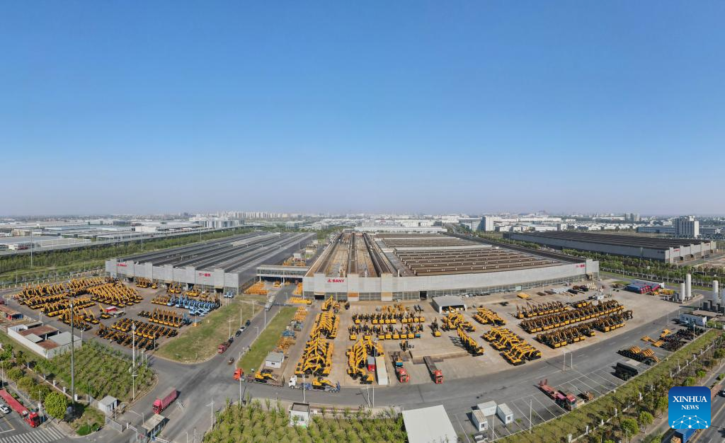 An aerial drone photo taken on April 15, 2025 shows the exterior view of Shanghai Sany Heavy Machinery Co., LTD. in Shanghai, east China, April 15, 2025. (Xinhua/Fang Zhe)