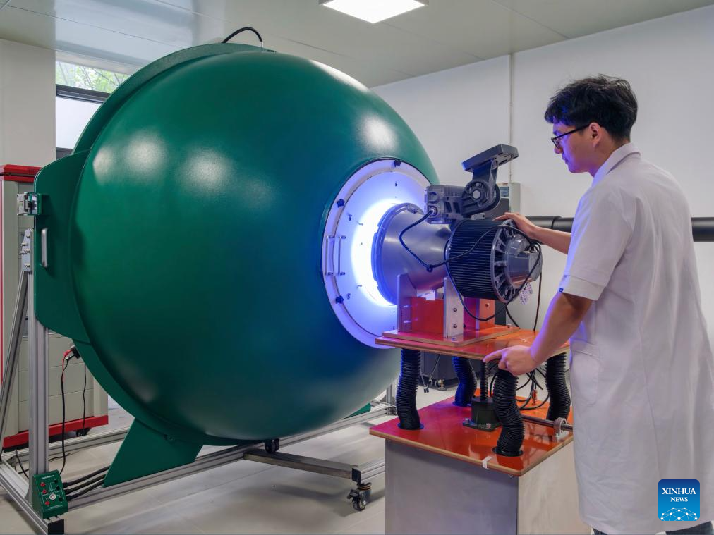 A technician works at the electrolyzer test area of a hydrogen technology company in Shanghai, east China, April 24, 2025. (Xinhua/Lu Peng)
