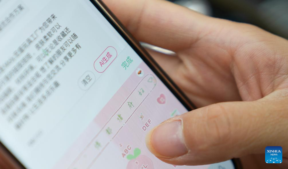 A colleague of Sun Lijuan displays a mobile app with an AI-powered virtual persona feature at the Yiwu International Trade Mart in Yiwu, east China's Zhejiang Province, May 20, 2025. (Xinhua/Han Chuanhao)