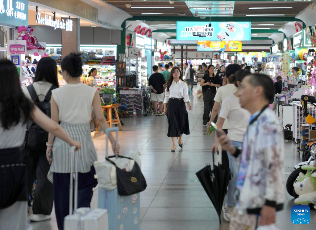 Sun Lijuan (C) works inside her shop at the Yiwu International Trade Mart in Yiwu, east China's Zhejiang Province, May 20, 2025. (Xinhua/Han Chuanhao)