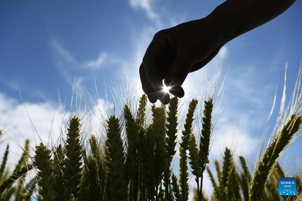 A farmer checks the growth of wheat in Yulong Naxi Autonomous County in Lijiang City, southwest China's Yunnan Province, May 21, 2025. The traditional Chinese solar term Xiaoman (Grain Buds) falls on May 21 this year, indicating that grain seeds are becoming full. (Photo by Zhao Qingzu/Xinhua)