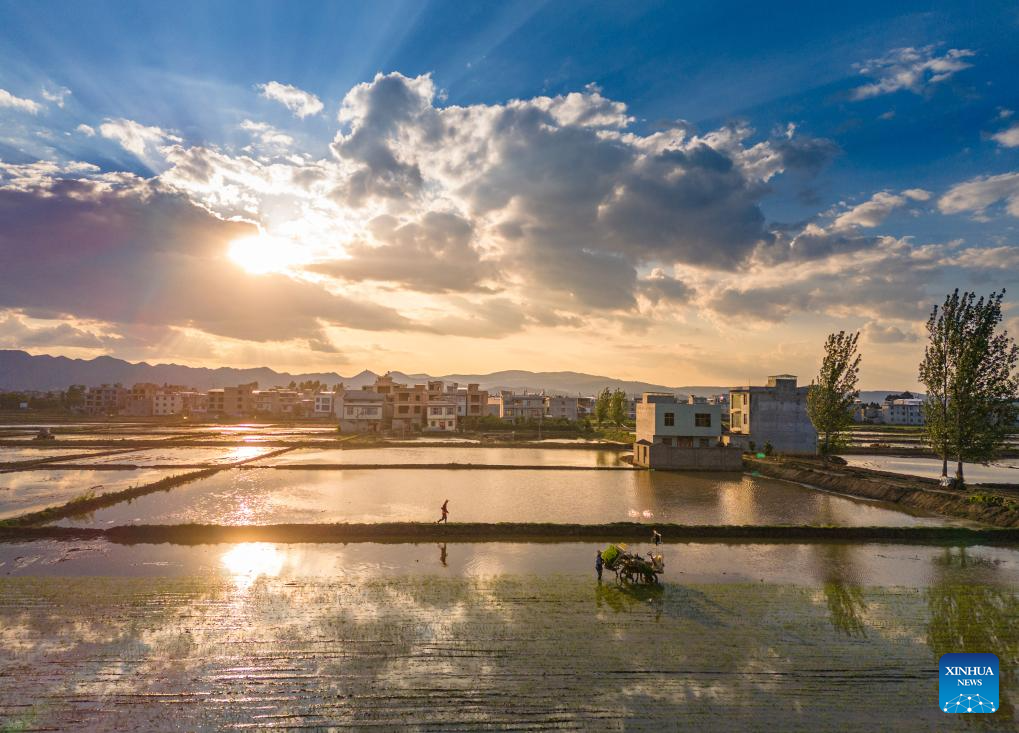Farmers transplant rice seedlings at the paddy fields in Jinning District of Kunming City, southwest China's Yunnan Province, May 21, 2025. The traditional Chinese solar term Xiaoman (Grain Buds) falls on May 21 this year, indicating that grain seeds are becoming full. (Photo by Song Guangxu/Xinhua)
