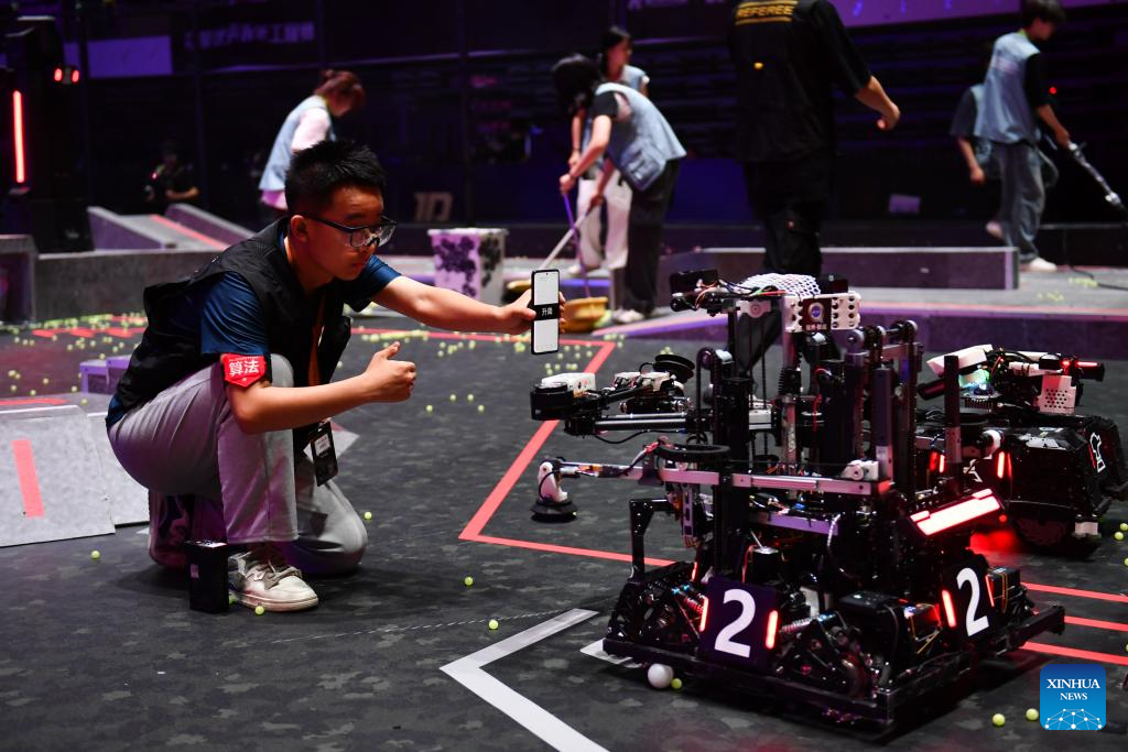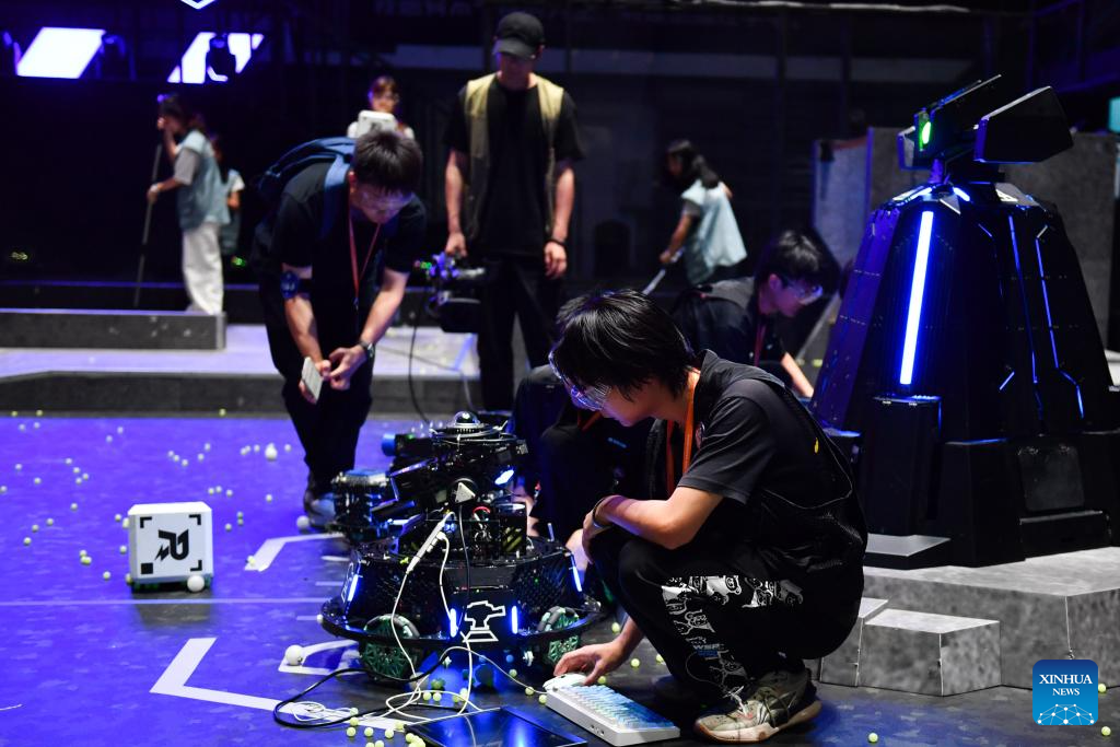 Contestants from Hefei University of Technology test their robots during the RoboMaster 2025 University Championship Regional Competition in Changsha, central China's Hunan Province, May 21, 2025. The five-day regional competition kicked off here on Wednesday, attracting teams from 32 universities of China. (Xinhua/Chen Zhenhai)