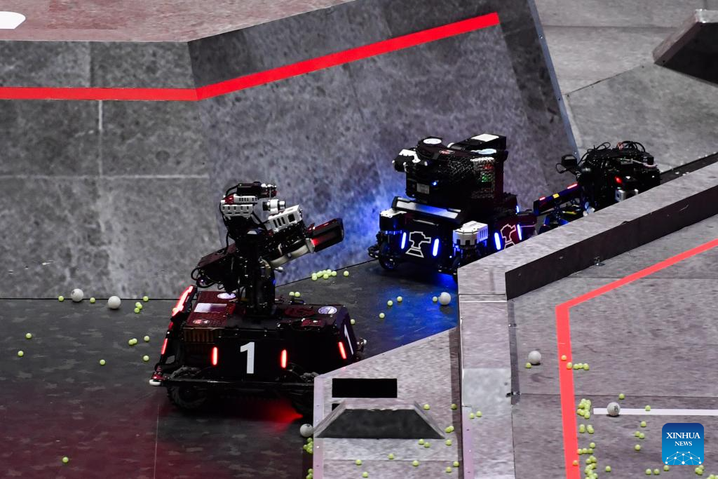 Robots compete during the RoboMaster 2025 University Championship Regional Competition in Changsha, central China's Hunan Province, May 21, 2025. The five-day regional competition kicked off here on Wednesday, attracting teams from 32 universities of China. (Xinhua/Chen Zhenhai)