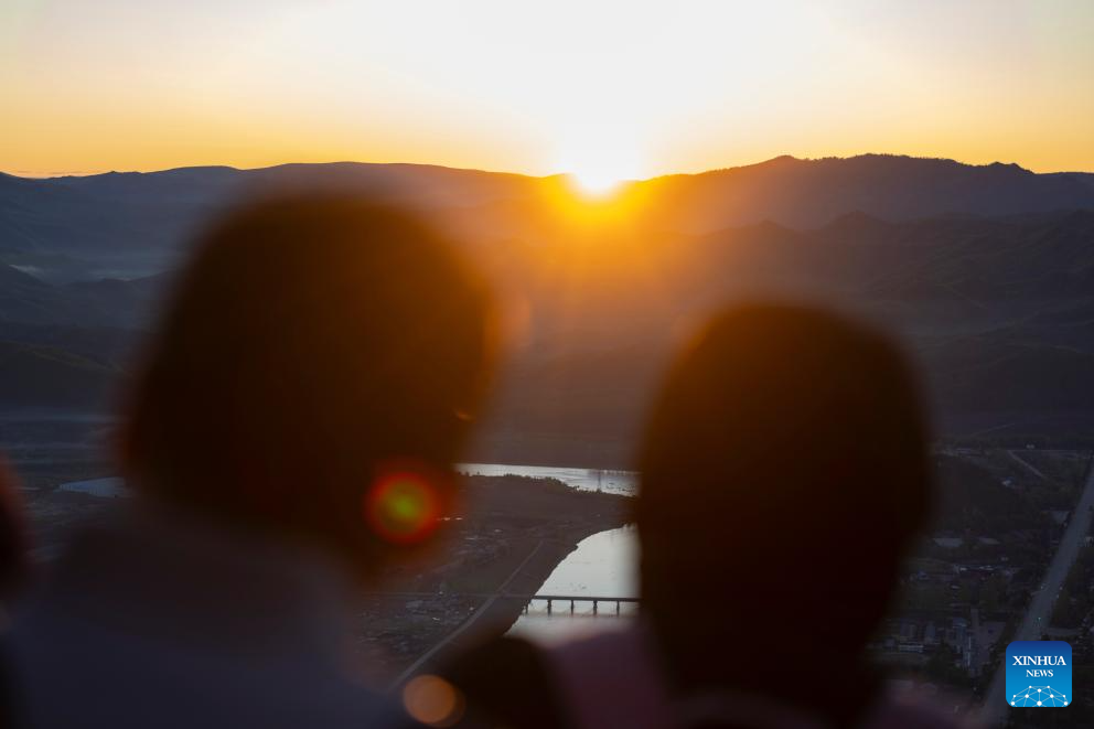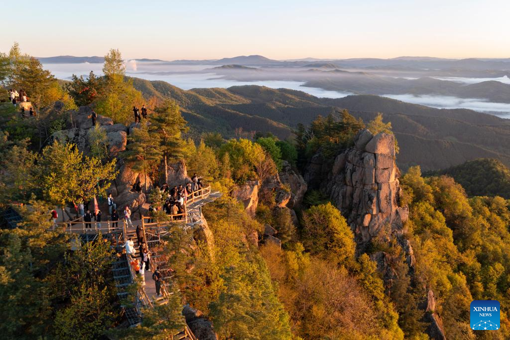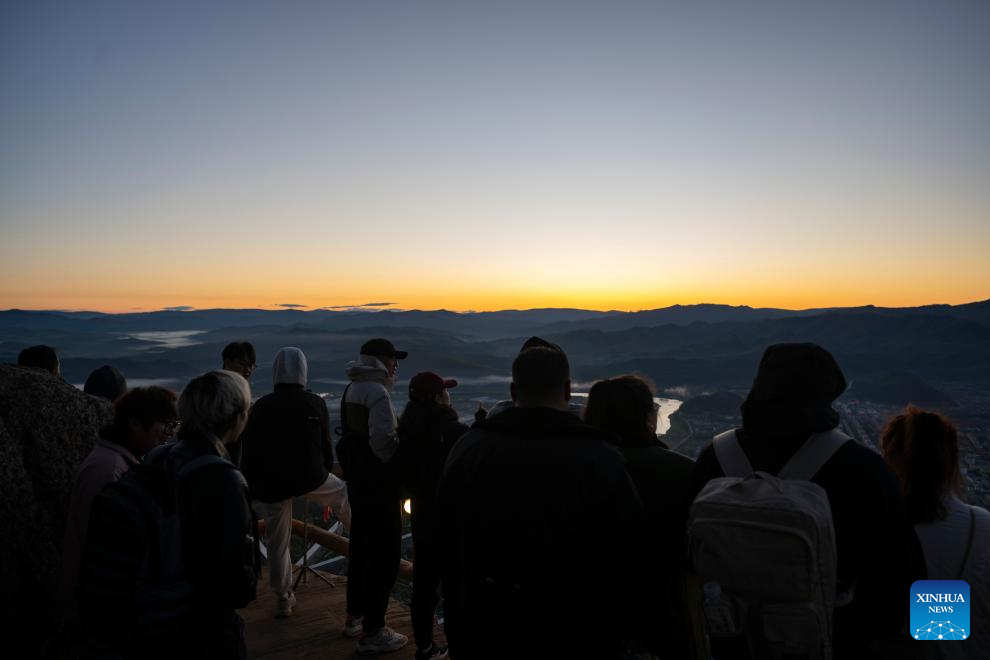 Tourists enjoy the sunrise at the Jinzu Peak in Yichun, northeast China's Heilongjiang Province, May 21, 2025. Jinzu Peak scenic area attracts numerous tourists with its stunning sunrise and sea of clouds. (Xinhua/Xie Jianfei)