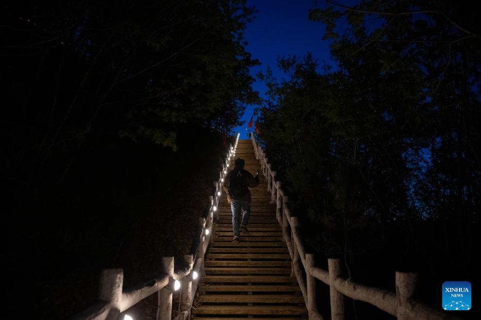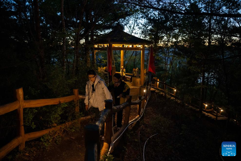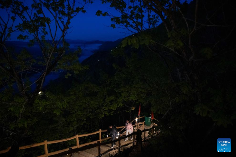Tourists hike to Jinzu Peak to watch the sunrise in Yichun, northeast China's Heilongjiang Province, May 21, 2025. Jinzu Peak scenic area attracts numerous tourists with its stunning sunrise and sea of clouds. (Xinhua/Xie Jianfei)