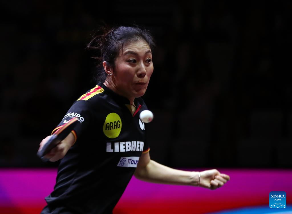 Han Ying hits a return during the women's singles round of 32 match between Wang Manyu of China and Han Ying of Germany at ITTF World Table Tennis Championships Finals Doha 2025 in Doha, Qatar, May 21, 2025. (Xinhua/Wang Dongzhen)