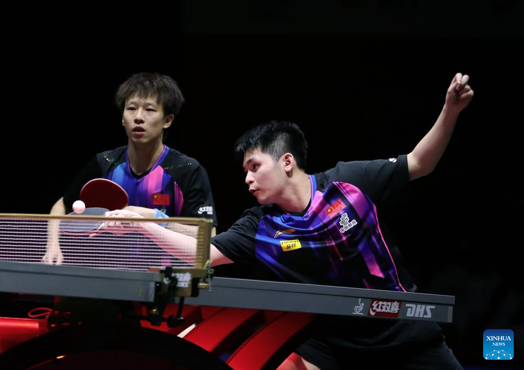 Lin Gaoyuan/Lin Shidong (R) compete during the men's doubles round of 16 match between Lin Gaoyuan/Lin Shidong of China and Jang Woojin/Cho Daeseong of South Korea at ITTF World Table Tennis Championships Finals Doha 2025 in Doha, Qatar, May 21, 2025. (Xinhua/Wang Dongzhen)