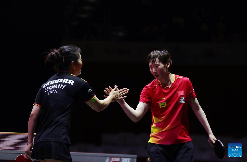 Wang Manyu of China (R) greets Han Ying of Germany after their women's singles round of 32 match at ITTF World Table Tennis Championships Finals Doha 2025 in Doha, Qatar, May 21, 2025. (Xinhua/Wang Dongzhen)