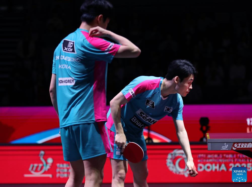 Jang Woojin (R)/Cho Daeseong compete during the men's doubles round of 16 match between Lin Gaoyuan/Lin Shidong of China and Jang Woojin/Cho Daeseong of South Korea at ITTF World Table Tennis Championships Finals Doha 2025 in Doha, Qatar, May 21, 2025. (Xinhua/Wang Dongzhen)
