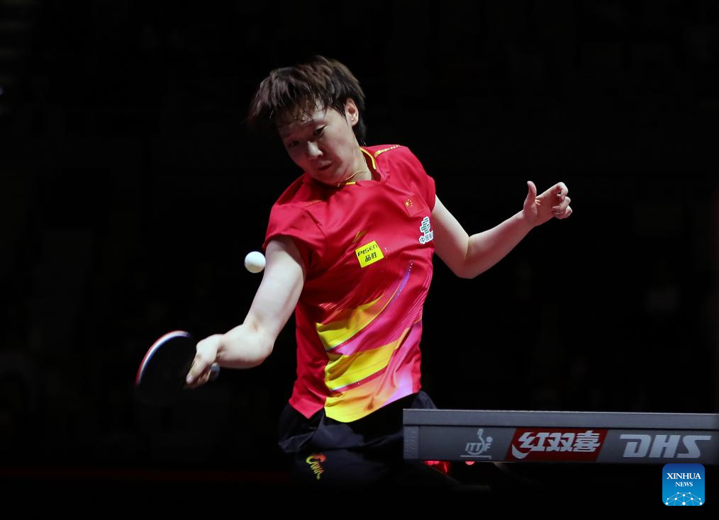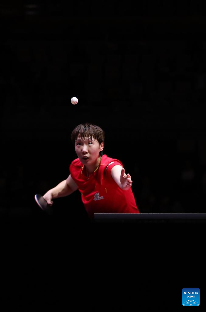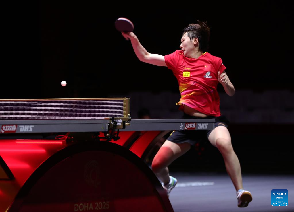 Wang Manyu hits a return during the women's singles round of 32 match between Wang Manyu of China and Han Ying of Germany at ITTF World Table Tennis Championships Finals Doha 2025 in Doha, Qatar, May 21, 2025. (Xinhua/Wang Dongzhen)