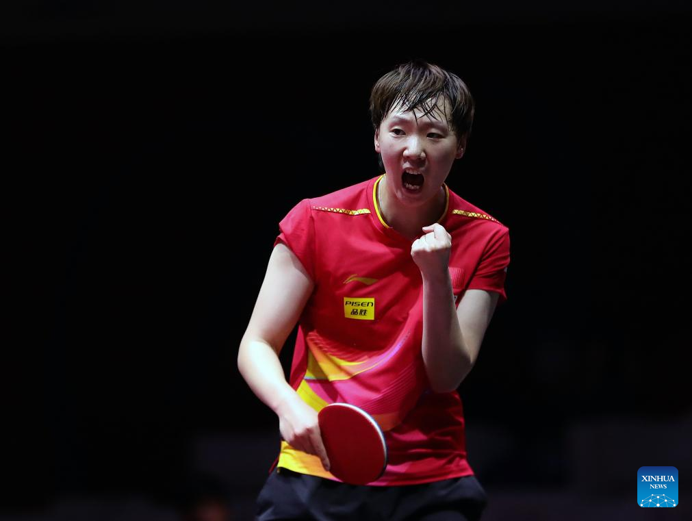 Wang Manyu celebrates during the women's singles round of 32 match between Wang Manyu of China and Han Ying of Germany at ITTF World Table Tennis Championships Finals Doha 2025 in Doha, Qatar, May 21, 2025. (Xinhua/Wang Dongzhen)