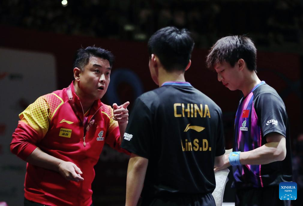 China's coach Wang Hao (L) instructs Lin Gaoyuan/Lin Shidong (C) during the men's doubles round of 16 match between Lin Gaoyuan/Lin Shidong of China and Jang Woojin/Cho Daeseong of South Korea at ITTF World Table Tennis Championships Finals Doha 2025 in Doha, Qatar, May 21, 2025. (Xinhua/Wang Dongzhen)