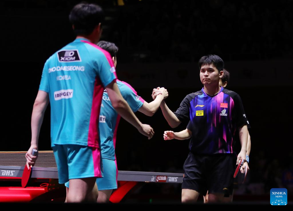 Lin Gaoyuan (1st R)/Lin Shidong (2nd R) greet Jang Woojin/Cho Daeseong (1st L) after the men's doubles round of 16 match between Lin Gaoyuan/Lin Shidong of China and Jang Woojin/Cho Daeseong of South Korea at ITTF World Table Tennis Championships Finals Doha 2025 in Doha, Qatar, May 21, 2025. (Xinhua/Wang Dongzhen)