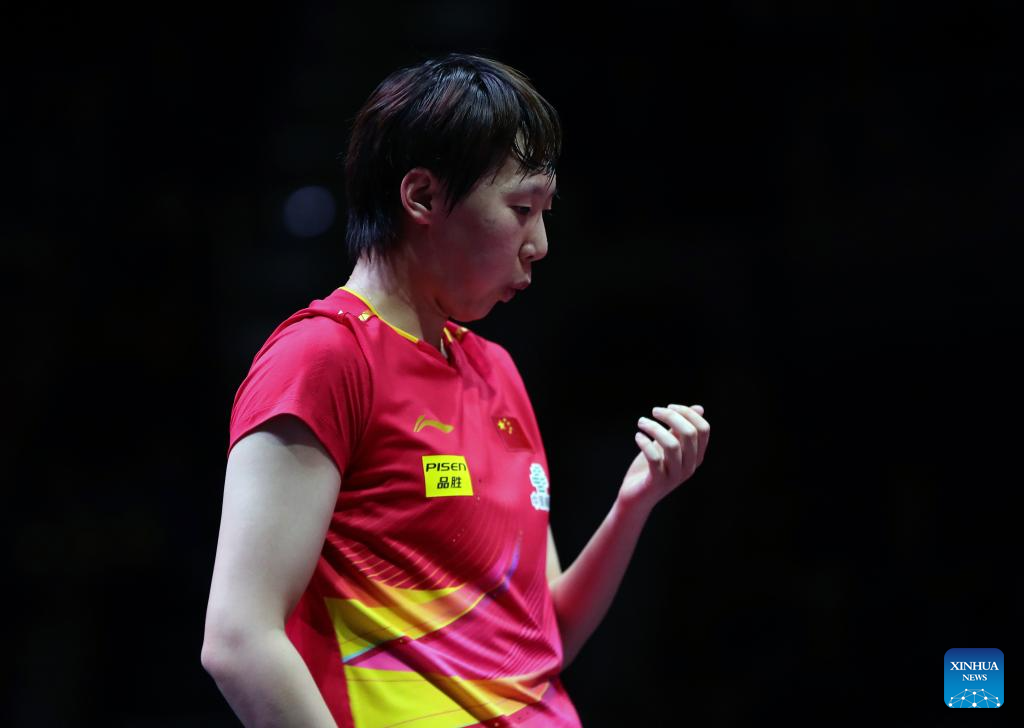 Wang Manyu reacts during the women's singles round of 32 match between Wang Manyu of China and Han Ying of Germany at ITTF World Table Tennis Championships Finals Doha 2025 in Doha, Qatar, May 21, 2025. (Xinhua/Wang Dongzhen)